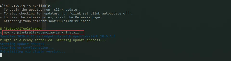 Step1:接下来我需要安装OpenClaw接入飞书的插件,虽然OpenClaw里内置了飞书插件,但这里我选择了飞书提供的官方插件来接入。打开命令行(CLI)工具,输入安装官方插件的命令”npx -y @larksuite/openclaw-lark install”,按回车后自动安装飞书插件。