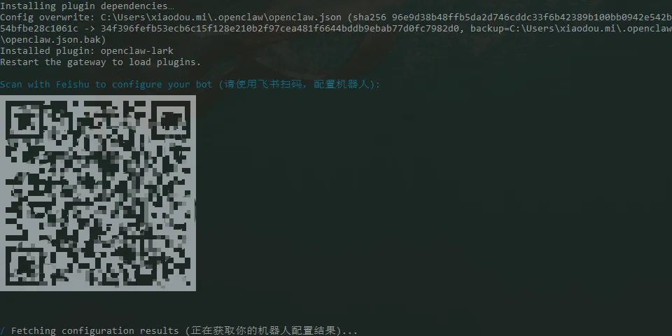 Step2:在完成插件安装后,会自动生成配置机器人的二维码,使用手机版飞书扫码进行新建机器人或选择已有的机器人。