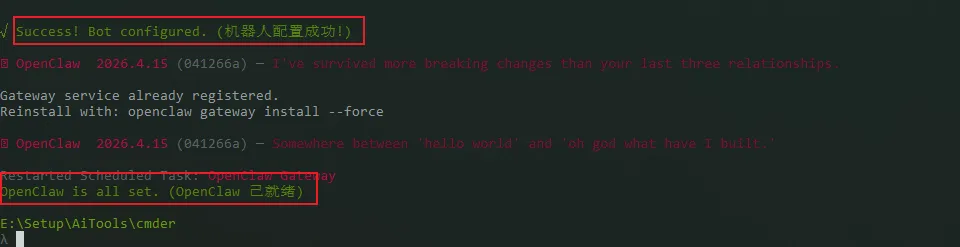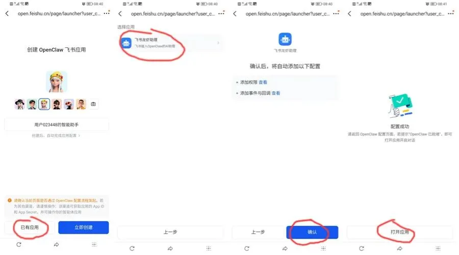 Step3:这里我按提示选择上面已经创建好的机器人应用,并确认授权,完成操作后会提示机器人配置成功,这样把飞书接入到OpenClaw就完成了。