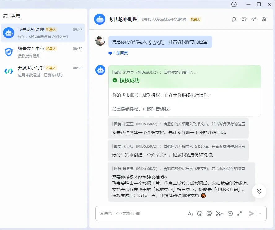 Step2:这时我想在飞书中给龙虾下达一个执行的命令,让它去创建一个飞书文档,文档中写入自己的个人介绍。