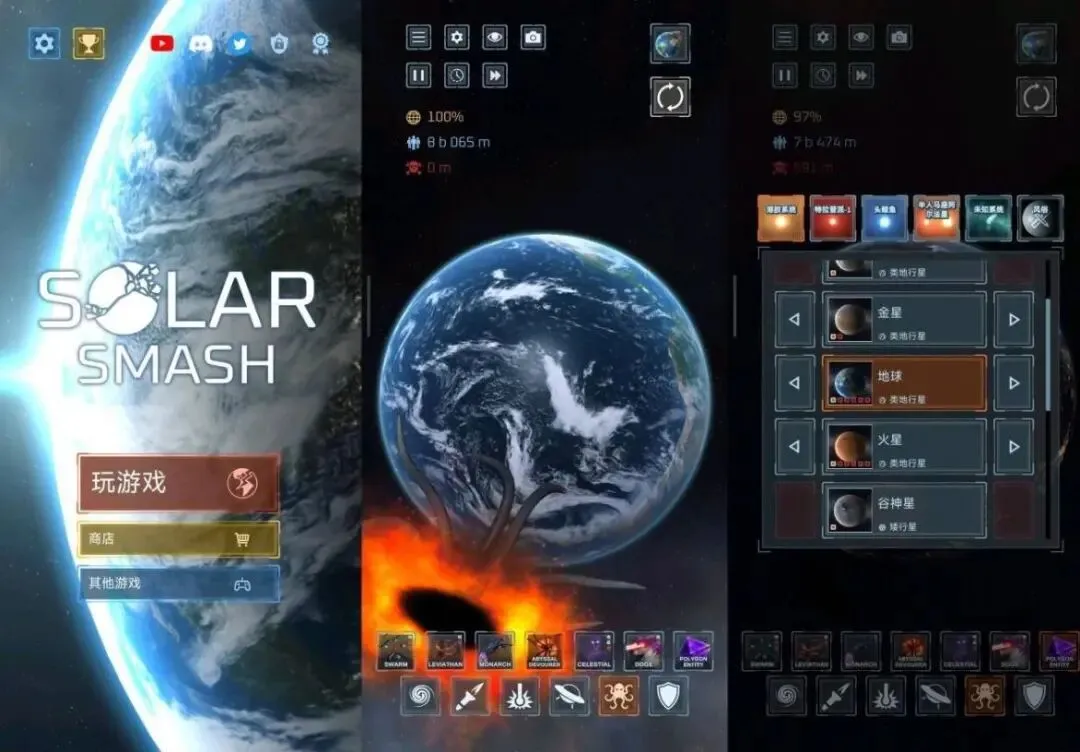 你可以用黑洞、外星触手、小行星雨、激光武器等几十种道具花式摧毁行星,也能自定义天体参数、打造专属星系,甚至模拟宇宙级灾难场景。