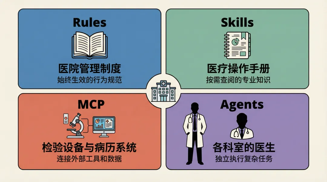 医院的管理制度(Rules)规定了所有人都必须遵守的基本规范——手术前必须洗手、处方必须双人核对。医疗操作手册(Skills)则是各种专业操作的详细指南——心脏搭桥手术怎么做、急救流程是什么。检验设备和病历系统(MCP)让医生能够获取化验结果、调阅影像资料、查看患者历史。而各科室的医生(Agents)则是独立思考、自主行动的专业人员,他们遵循制度、参考手册、使用设备,最终完成诊疗任务。