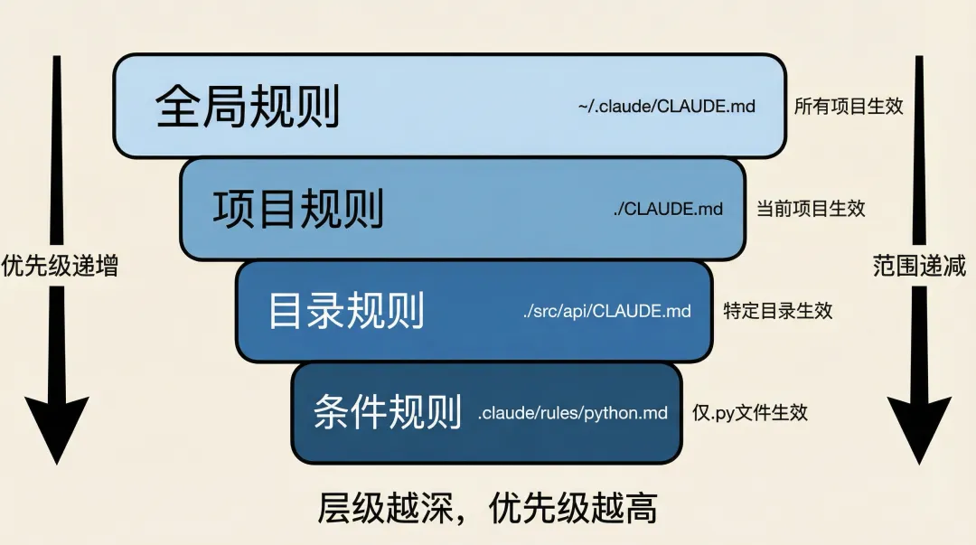 全局规则 ~/.claude/CLAUDE.md → 所有项目生效项目规则 ./CLAUDE.md → 当前项目生效目录规则 ./src/api/CLAUDE.md → 特定目录生效条件规则 .claude/rules/python.md → 仅处理 .py 文件时生效