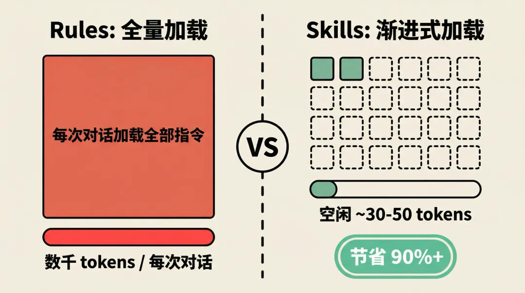 这意味着你可以安装几十个 Skill,但只在需要时才消耗上下文窗口。相比把所有指令塞进 Rules(每次对话都全量加载),Skills 节省了 90% 以上的 token 开销。