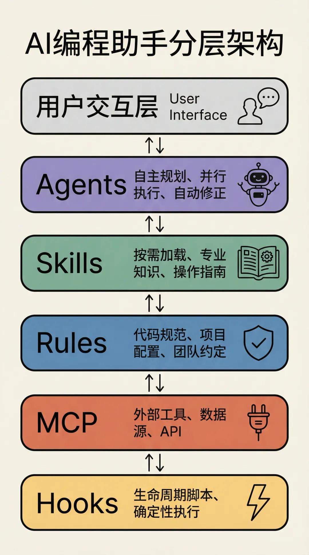 ┌─────────────────────────────────────────────────┐│ 用户交互层 ││ 你输入指令,AI 回复结果 │├─────────────────────────────────────────────────┤│ Agents(执行层) ││ 自主规划、并行执行、检查结果、自动修正 │├─────────────────────────────────────────────────┤│ Skills(知识层) ││ 按需加载的专业知识、工作流程、操作指南 │├─────────────────────────────────────────────────┤│ Rules(约束层) ││ 始终生效的代码规范、项目配置、团队约定 │├─────────────────────────────────────────────────┤│ MCP(连接层) ││ 标准化的外部工具和数据源接口 │├─────────────────────────────────────────────────┤│ Hooks(自动化层) ││ 确定性的生命周期脚本,不依赖 AI 推理 │└─────────────────────────────────────────────────┘