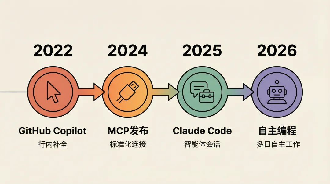 AI 编程工具的演进路径清晰可见——从 2022 年的行内补全(Copilot),到 2025 年的智能体会话(Claude Code),再到 2026 年的多日自主编程(Kiro)。