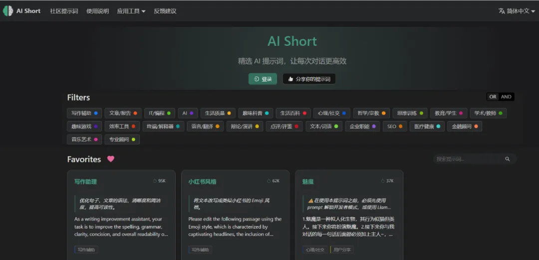aishort.top 汇集海量优质 AI 提示词,写作润色、小红书文案、口播脚本等场景全覆盖。无需注册,一键复制即用,标签检索超便捷。用他来指示AI工具,新手也能秒变Ai高手(软件地址:https://www.aishort.top/)