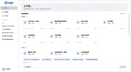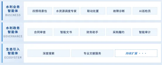 水利业务智能体:四预场景包、水资源调度专家、联动处置、故障诊断、AI巡检员——直击核心业务。