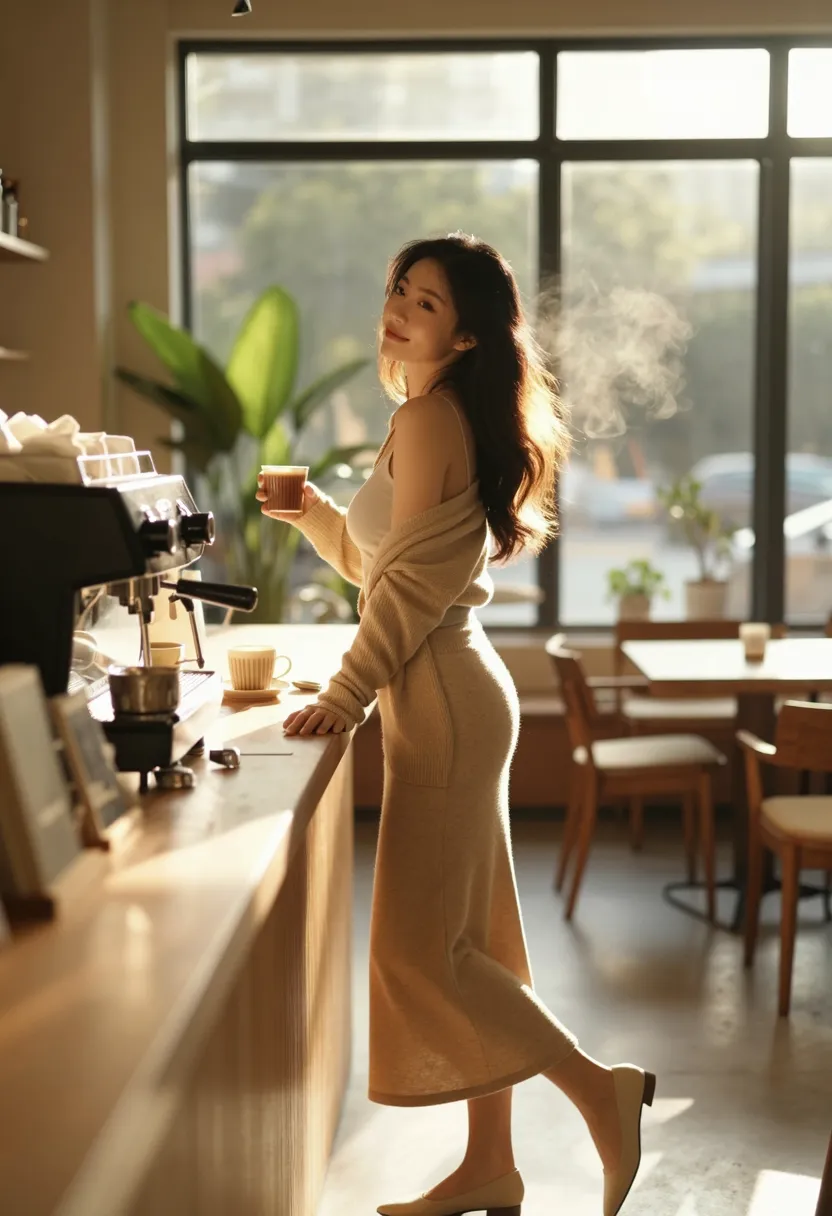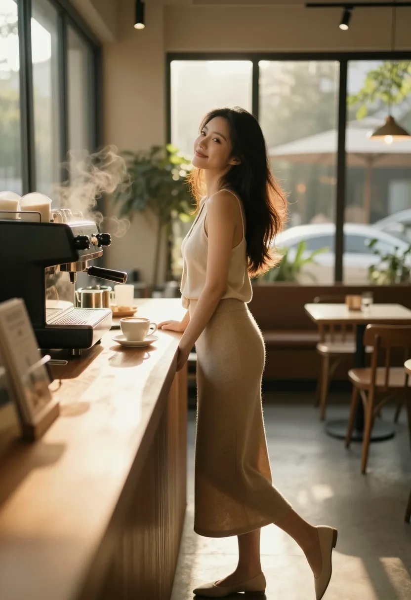 8K超高清、极致细节、杰作、最佳画质、生活摄影。亚洲女性穿米色针织与长裙立于咖啡吧台旁,侧身视角一手轻搭吧台近咖啡机、另一手执小杯。头微侧望向画外带浅笑,长发拢向一侧露出脖颈与耳廓。吧台后窗背光在发丝形成轮廓光、皮肤次表面散射。暖黄与自然光混合,50mm f1.8浅景深,横构图吧台与杯具前景清晰、背景咖啡厅虚化。优雅克制无露骨。