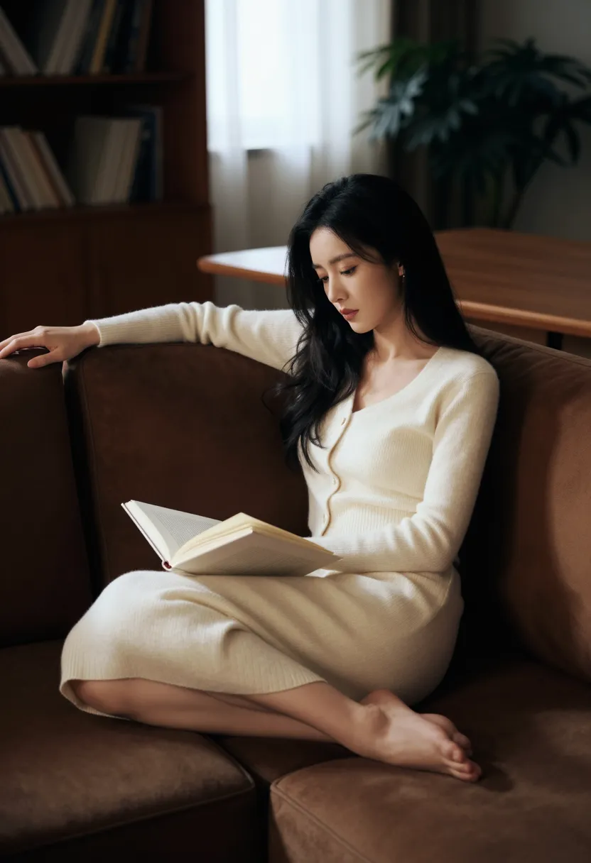 8K超高清、极致细节、杰作、最佳画质、电影感肖像。亚洲女性穿奶油色开衫与长裙蜷在深色沙发角落,膝上摊开平装书一手捏书角一手放松搭在靠垫,双腿收向一侧未交叉。黑色长发散在靠垫与肩头,目光垂落书页专注宁静。柔和顶光与窗光填充形成伦勃朗式阴影与体积感氛围,暖奶油与木色调。35mm f1.4中广角略高机位拍全身放松姿态,书架与绿植柔焦。私密而克制无裸露。