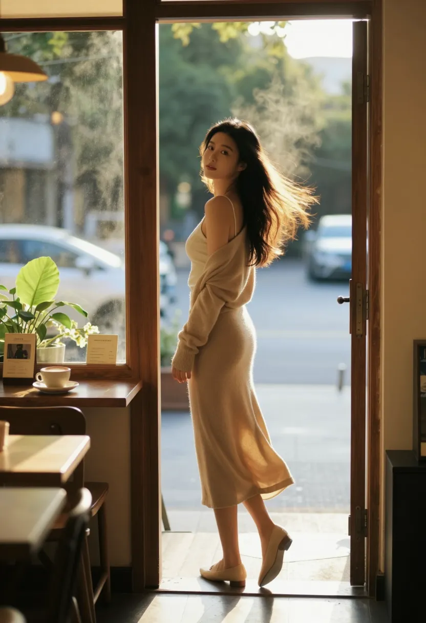 这个场景展现了8K超高清、极致细节、杰作、最佳画质、环境人像。亚洲女性穿米色针织与及踝长裙立于咖啡厅门口,身体朝向…画面构图精妙,光影运用恰到好处,充分展现了主角的魅力与气质。无论是服装细节还是环境氛围,都经过了精心的设计与布置。