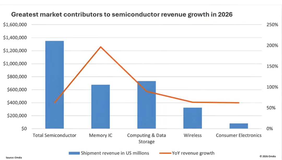 4 月 24 日消息,Omdia 英国当地时间 23 日发布最新预测,认为今年全球半导体收入将接近 1.4 万亿美元,整体同比增幅达到 62.7%。存储器仍将是 2026 年最为火热的市场,机构认为当前的供应瓶颈要到 2027 年中后期才会出现实质性的缓解。该机构认为今年 DRAM 内存市场规模将接近翻倍,而 NAND 闪存领域更是有可能达到 2025 年的 4 倍。此外,计算与数据存储细分领域也将实现 90% 的同比增长,总规模突破 7000 亿美元。与此同时,尽管智能手机出货量会下降,但由于单价的大幅攀升,这部分带来的半导体收入也将增长。