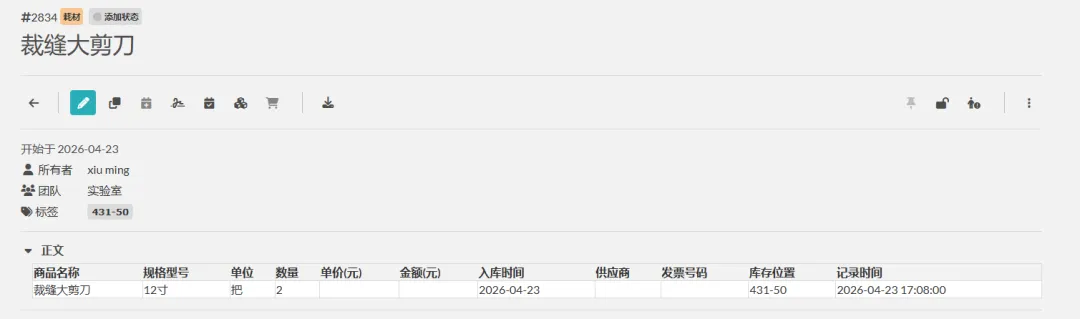 以前入库耗材要手动一项项输入名称、数量、位置……现在只要: