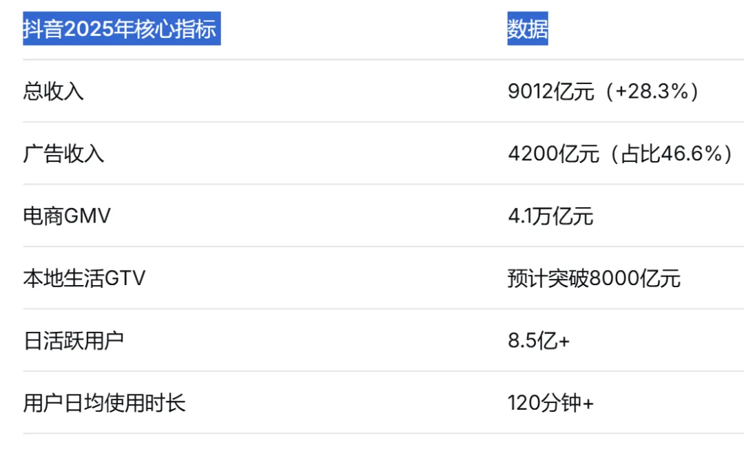 抖音2025年预计总收入约9012亿元,同比增长28.3%。电商GMV突破4万亿元,直逼拼多多。广告收入达4200亿元,占总收入46.6%。日活跃用户突破8.5亿,月活跃用户超10亿,日均使用时长超过120分钟。