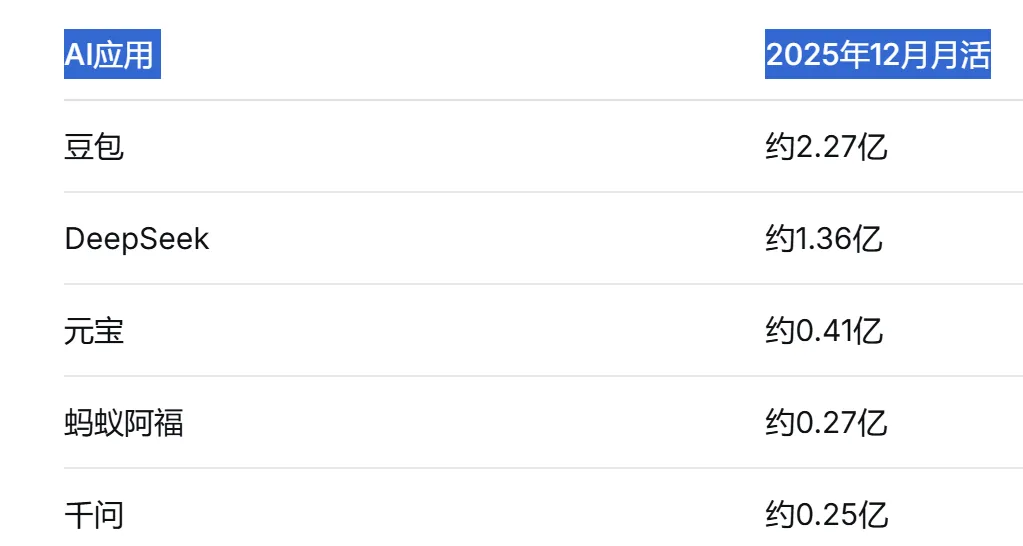 在AI产品端,字节的布局正在开花结果。QuestMobile数据显示,2025年12月,豆包月活约2.27亿,稳居国内AI原生应用第一,用户体量相当于DeepSeek、元宝、蚂蚁阿福、千问第2至5名的总和。