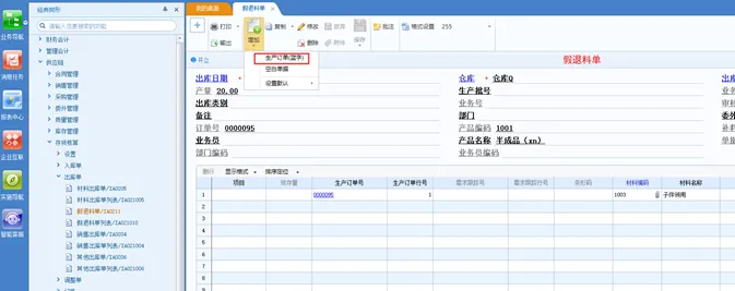 备注:此处我们参照生产订单做假退料单来演示。(手工做假退料单除了和订单关联外,在存货核算报表中的体现形式和参照订单做的单据体现形式是一致的。)