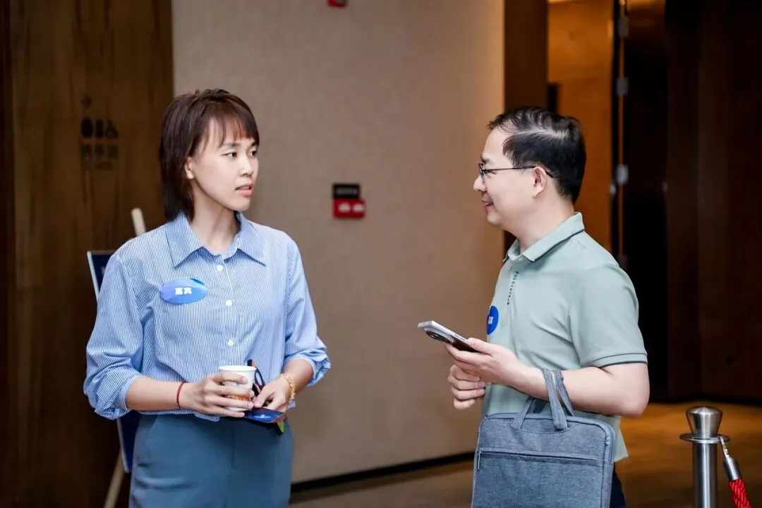 泊松软件大客户销售部副总经理黄炜瑜(左)与客户交流