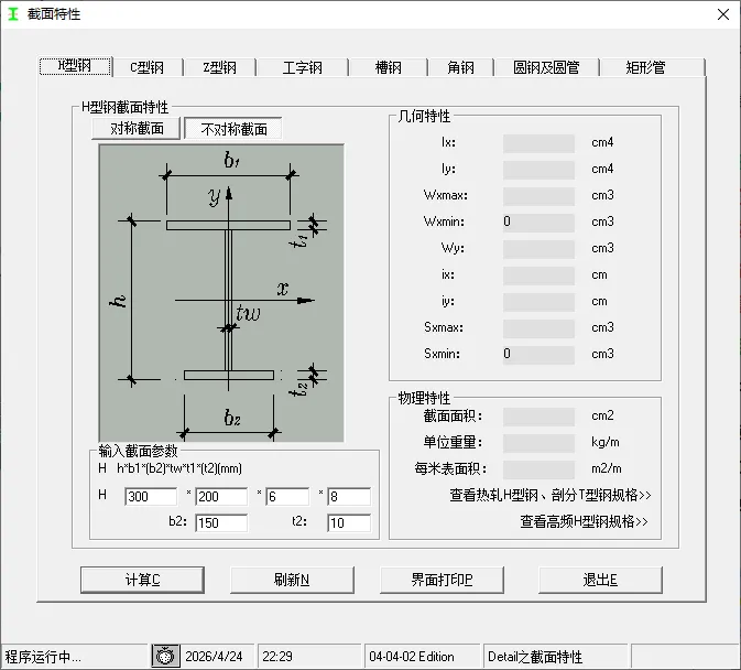 老规矩,先介绍:型钢截面特性查询及计算工具,是H型钢、C型钢、Z型钢、工字钢、槽钢、角钢、圆钢及圆管、矩形管的常用钢结构计算延米、截面积重量的软件。
