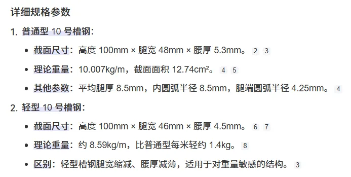 ↓↓首先要说的是,该软件是通用普通规格,我们使用工具绝对不能依靠单一工具,下面是某度关键词“10号槽钢规格”,我们可以看到普通和轻型是有重量差的,所以在计算后要做调整。