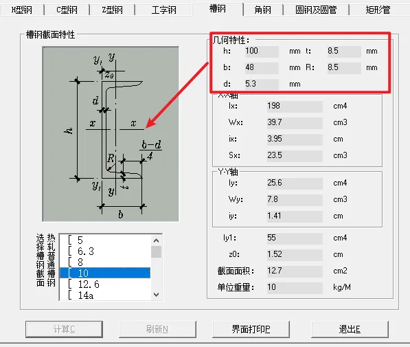 ↓↓日常工常见的槽钢、角钢龙骨,用在外墙,一些简单雨棚的方钢龙骨。使用该软件完全可以实现测算。下面以10#槽钢为例介绍: