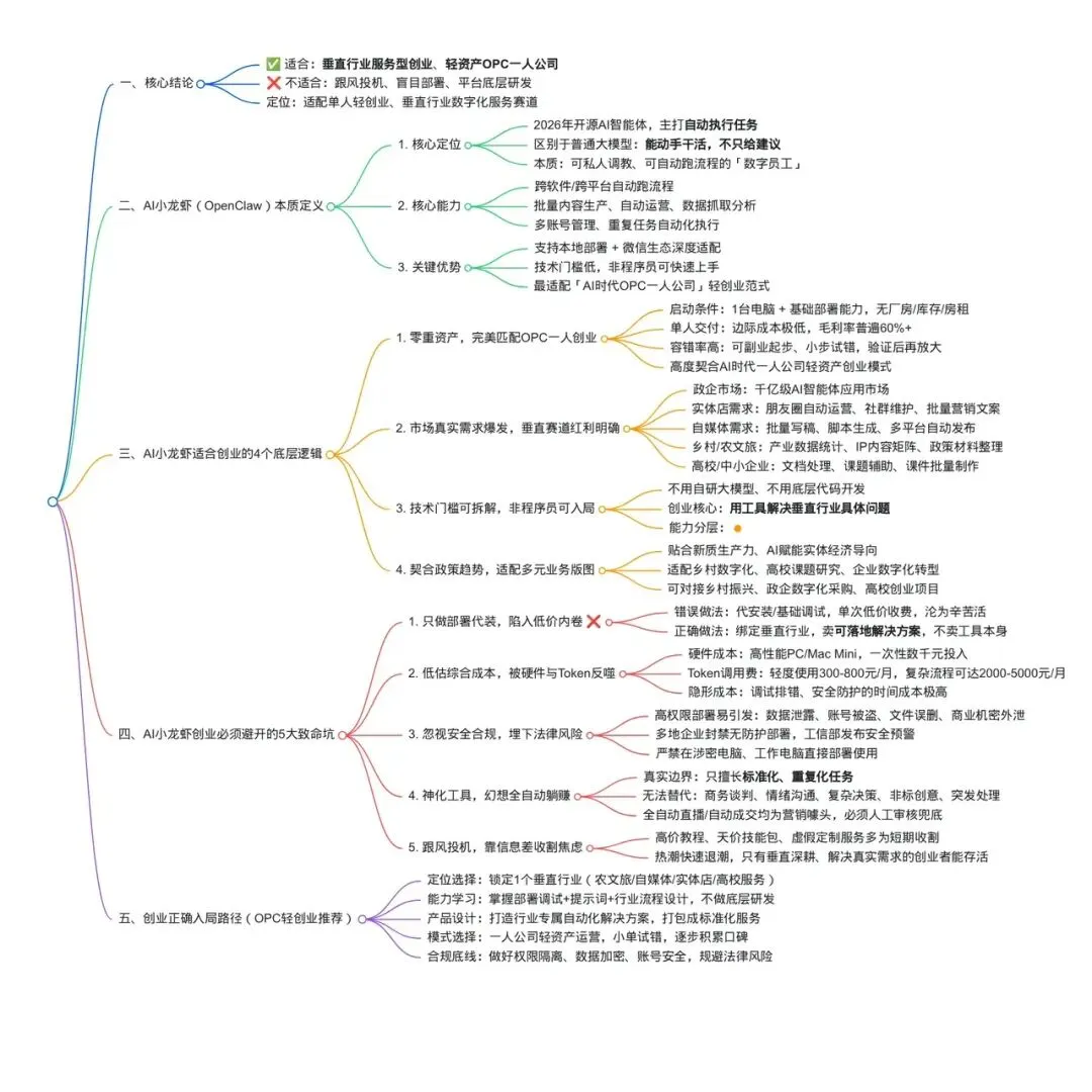 AI小龙虾 真的适合创业吗?先给核心结论:AI小龙虾(OpenClaw智能体)适合「垂直行业服务型创业」和「轻资产OPC一人公司」,完全不适合跟风投机、盲目部署、做平台研发。