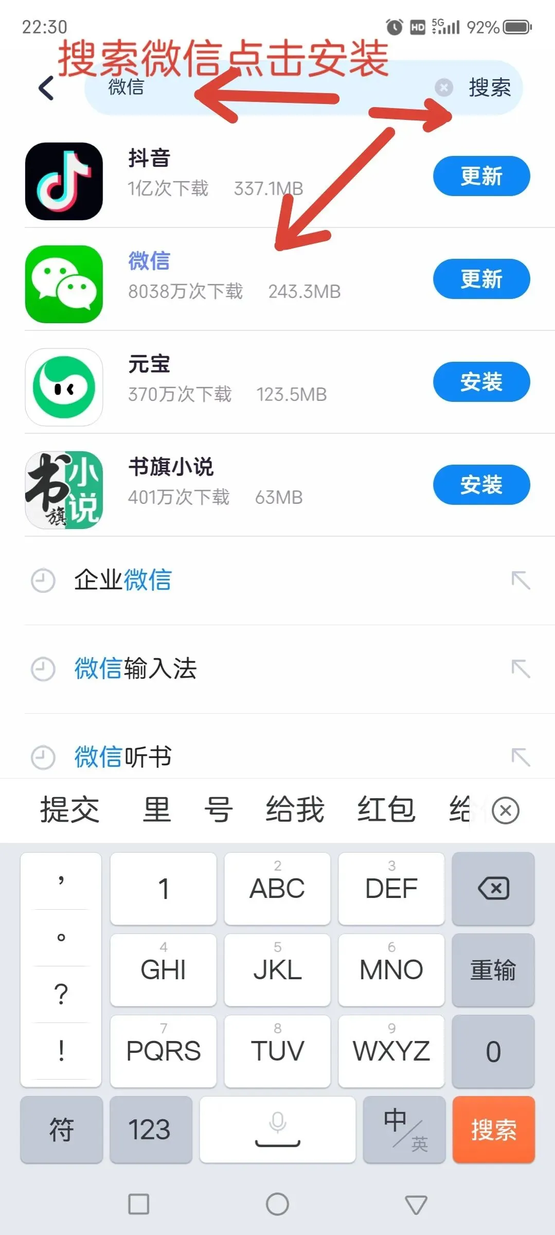 点开下载App软件后,在搜索栏输入关键词:微信,在出来的搜索结果里找到微信,点击安装-会自动下载即可(图片是已经下载,所以提示更新App新版本)。
