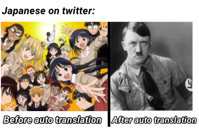 (X上最近流行的一张图,意思是没看到日本地区的仇恨内容以为都像动漫里面一样友善和活力,接触之后日本就像是二战战犯希特勒一样)