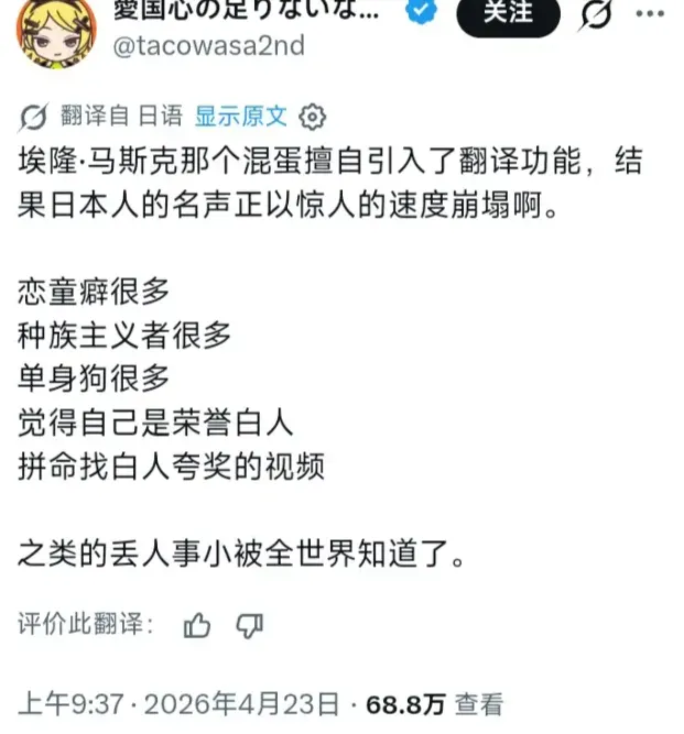 马斯克修改社交软件推荐算法,全世界网民突然嗅到了日本的恶臭