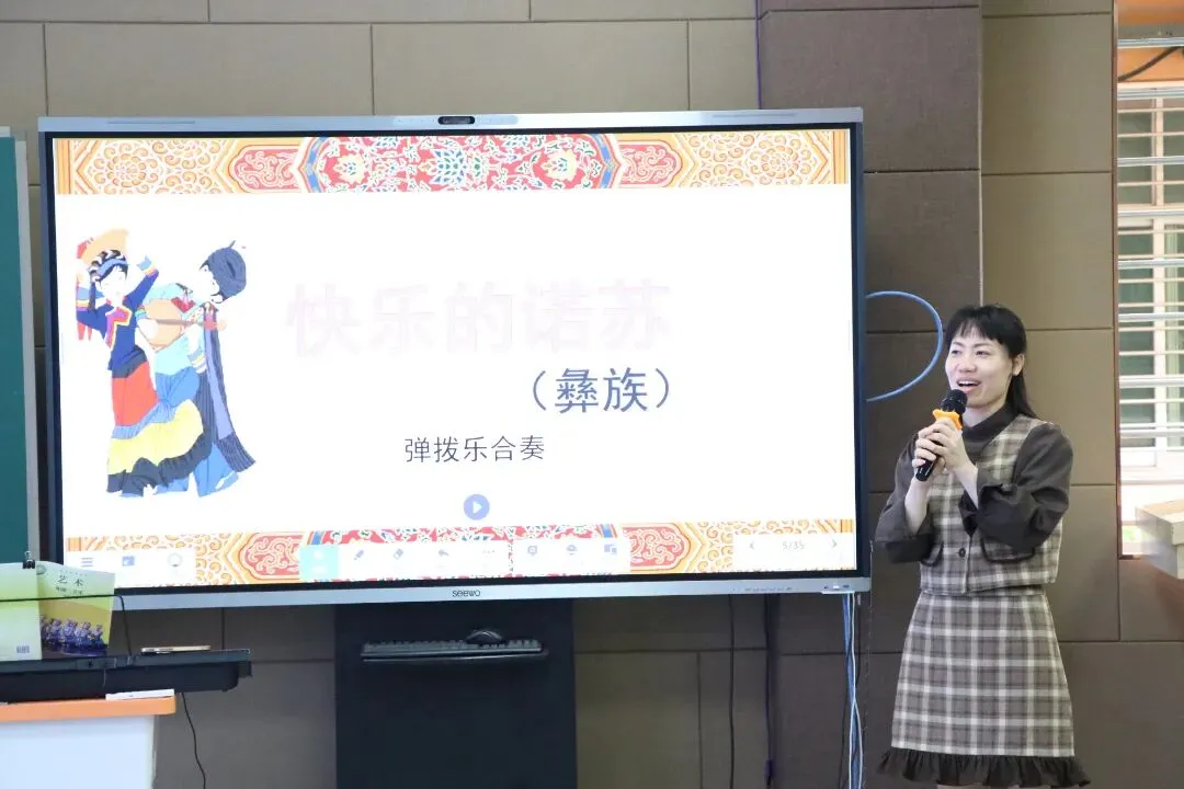 第二节课由灵水中心小学沈锋琳老师带来二年级音乐欣赏课《快乐的诺苏》。本课以AI数字人文化使者贯穿全程,构建“走进—探秘—聆听—细品—演绎—回味”的学习路径,引导学生感受彝族乐曲欢快热烈、优美抒情、热烈高涨的情绪变化,认识月琴、火把节等民族文化符号,在律动表演与合作实践中培育审美感知与文化理解,让民族音乐课堂更具沉浸感与互动性。