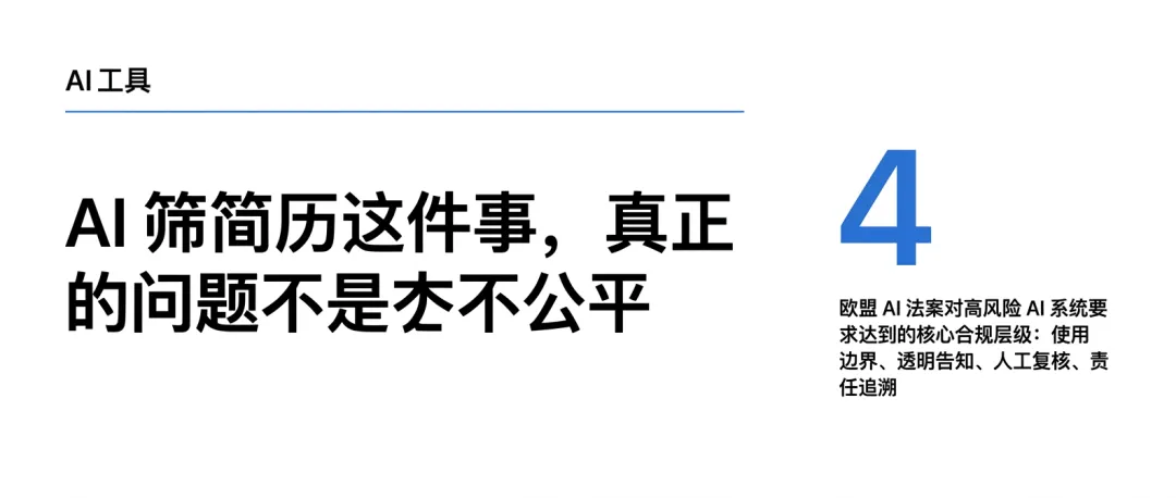 一个人被 AI 系统拒绝,他有权知道是什么因素导致了这个结果吗?目前大多数公司的回答是:没有义务告知。这在法律上可能站得住脚,但在社会信任层面是一个慢性毒药。欧盟的 AI 法案专门设置了「高风险 AI 系统」分类,招聘筛选被列在里面,要求提供可解释性和人工复核机制。不是因为欧洲人特别感性,而是因为他们算清楚了:一旦公众对系统失去信任,整个行业都会付出更大代价。