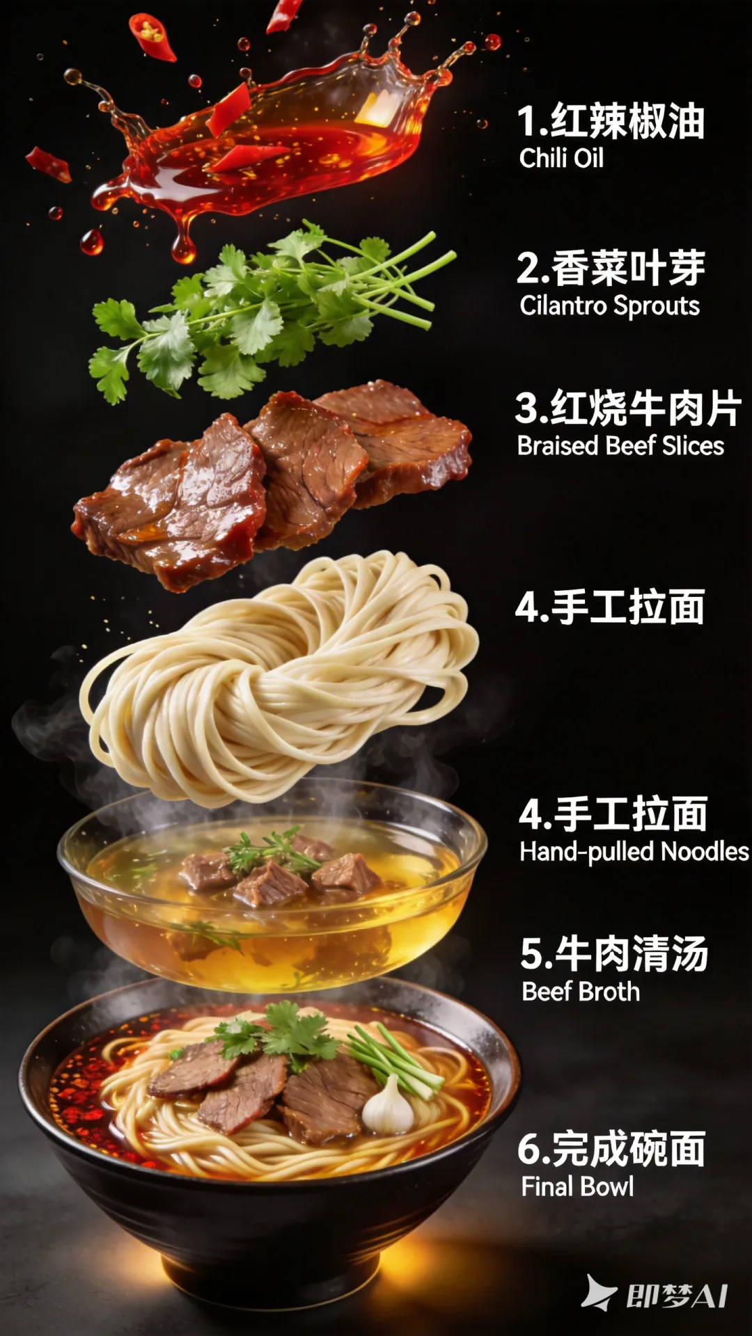 “一份牛肉面的分解图,以垂直展开视图呈现。采用超详细的商业食品摄影风格。 顶部显示漂浮的红辣椒油在空中飞溅,油滴和辣椒片在运动中被定格,鲜红色,光泽质感,戏剧性的灯光效果。 下面,香菜叶芽悬浮着,鲜绿色,脆嫩,充满生机。 下一层是红烧牛肉片,质地嫩滑,表面多汁,呈丰富的棕色,略有光泽,悬浮在空中。 再下面是手工拉制的面条,以动态的飞行动作卷曲,表面光滑,呈现出真实的小麦质感。 面条下面是一碗透明的牛肉清汤,汤色金黄,里面有小块牛肉和香草,蒸汽缓缓上升。 所有食材以优雅的垂直堆叠方式悬浮,每层分开。 最底部显示完成的牛肉面碗,浓郁的汤底,面条浸没其中,上面有辣椒油、牛肉片、香菜和大蒜芽。 黑色背景,边缘照明,产品海报风格,高清晰度,高对比度,戏剧性的工作室灯光。 标签和数字整齐地排列在每层旁边,用中文和英文标注。 整体美学:高端食品广告,干净,光泽,高端,3D般的真实感。”