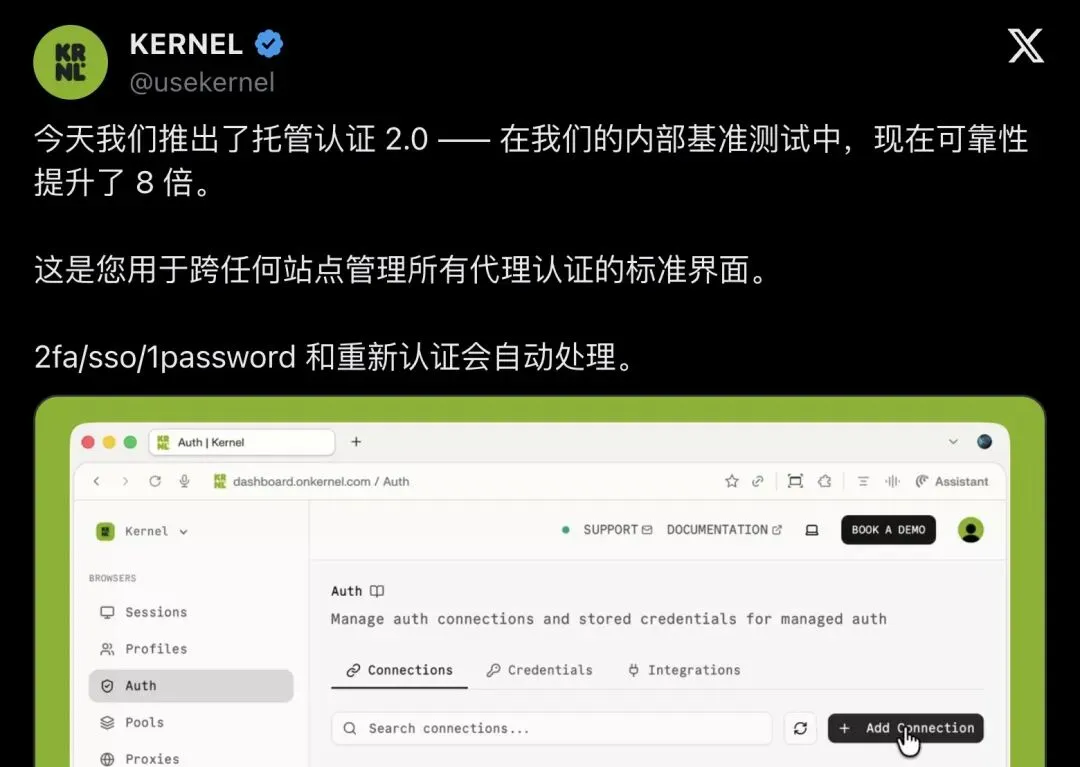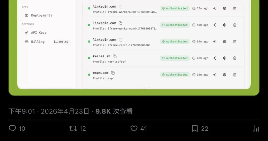 ▲ Kernel 官宣 Managed Auth 2.0,附带产品仪表盘截图,可以看到 LinkedIn、ESPN 等多个域名均显示「Authenticated」状态。约 9800 人浏览,41 人点赞。