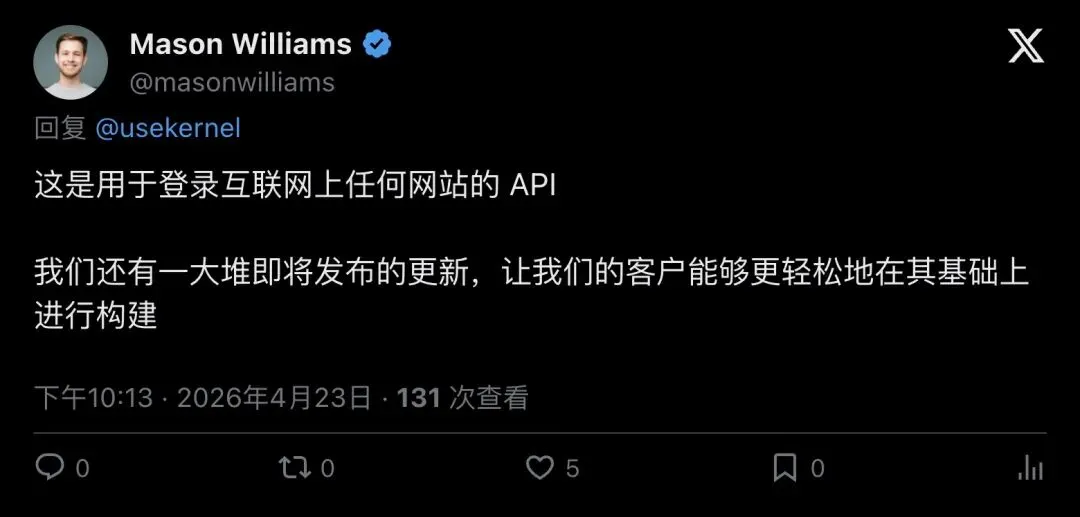 换句话说,Kernel 解决了一大块现实场景中的认证摩擦,但凡是依赖「另一台设备上的人类操作」的验证步骤,仍然是自动化的禁区。