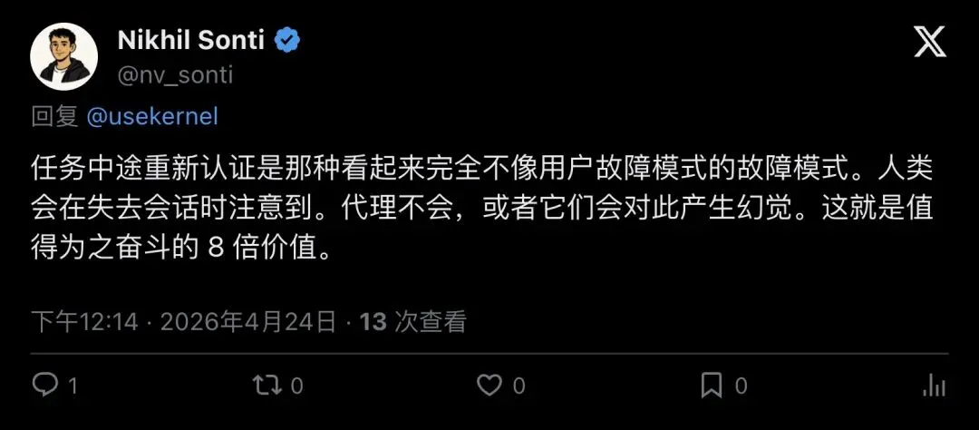 在所有社区反馈中,Nikhil Sonti 的回复质量最高。他一针见血地指出了 Agent 认证失败和人类认证失败之间的本质差异: