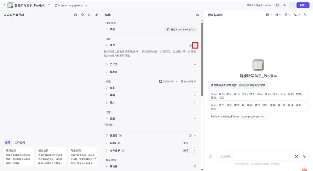 为什么要加插件?因为后面我们需要通过上传图片,或者直接拍照的方式,让智能体识别图片里的词语内容。这一步决定了你的AI听写助手能不能从纸质资料里直接提取内容。
