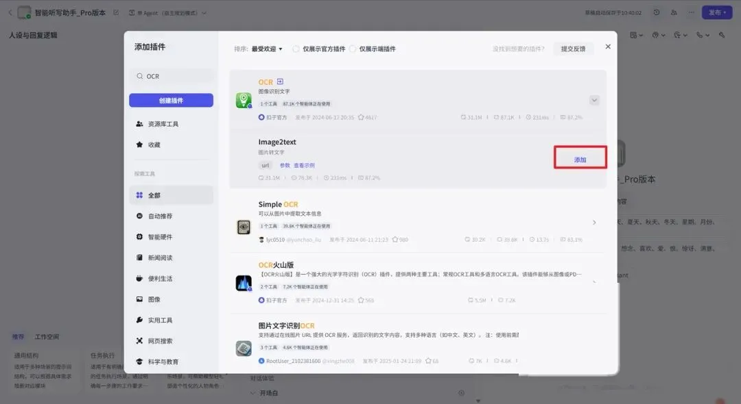 这里直接选择Coze官方提供的OCR识图插件就可以了,省事,而且兼容性更稳。