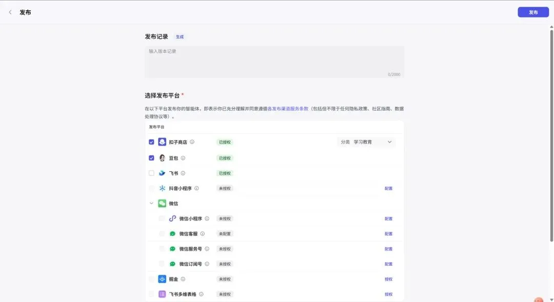 当你确认整个流程跑通,没有明显问题之后,就可以正式发布这个智能体了。