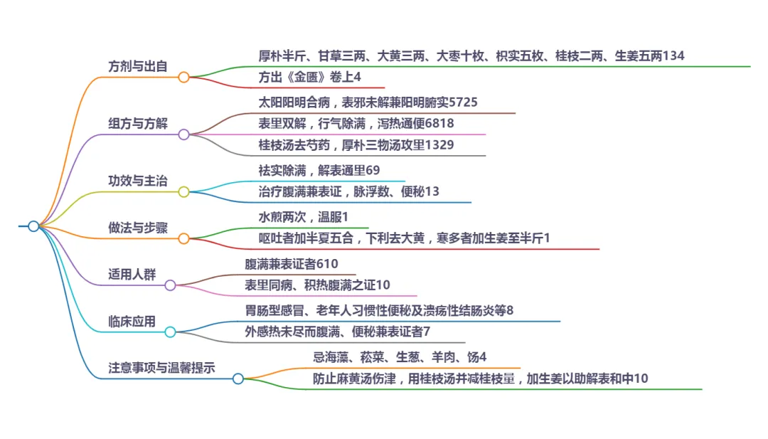 “ AI ” 厚朴七物汤:厚朴半斤、甘草三两、大黄三两、大枣十枚枳实五枚、桂枝二两、生姜五两,治疗腹满兼表证,脉浮数、便秘