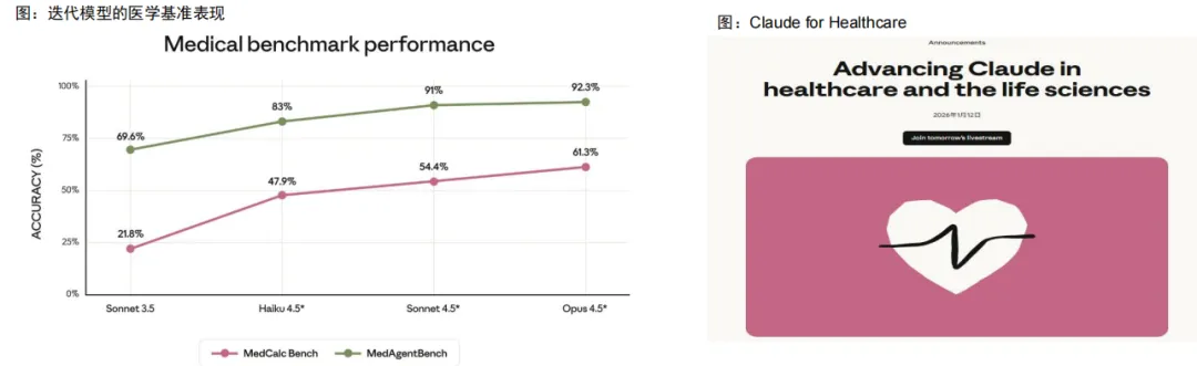 基于去年10月发布的Claude forLife Sciences,Anthropic于2026年1月12日发布Claude for Healthcare,一项符合美国《健康保险流通与责任法案》要求的医疗服务,面向医院、医疗机构和个人用户开放。