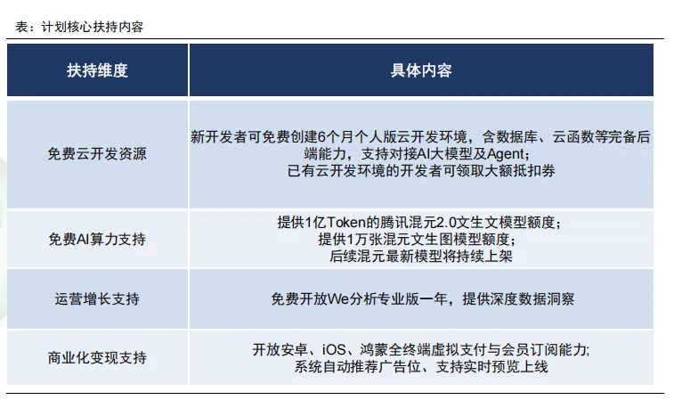 2026年1月5日推出AI应用及线上工具小程序成长计划,提供云开发资源、AI算力、数据分析、广告变现及流量激励等全方位支持,覆盖2026年全年,全周期陪伴开发者成长。