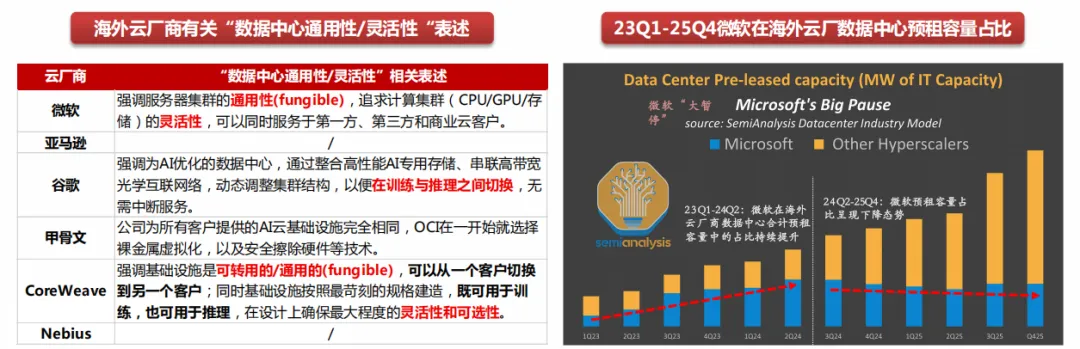 数据中心通用性成为云厂建设共识,以保证在不同计算任务之间灵活切换。目前,多数海外云厂商均强调,在建设数据中心时,目标是建立一个通用的、能支持多代技术和多种模型的超大规模计算业务,而非为单一技术或单一客户过度投资,以适应不同代际的GPU、满足更灵活的功率和冷却要求,同时能够在训练和推理工作负载之间灵活切换。根据SemiAnalysis信息,2024年中,微软基于风险与回报的考量,实施数据中心建设的“大暂停”,截至24Q2,微软在海外云厂商数据中心预租总量中的占比一度超过60%,而自25Q3开始,微软逐步停止租赁活动,其他超大云厂商的预租规模大幅增加,25Q4微软预租容量占比下降至25%。微软于2024年中开启的数据中心“大暂停”调整,代表着海外云厂商在FOMO capex和ROI capex之间的战略平衡,并强调数据中心是为多类模型、多代硬件设计,而非为单一模型、某一代硬件建设,基础设施需要灵活地跨越多方面要求。