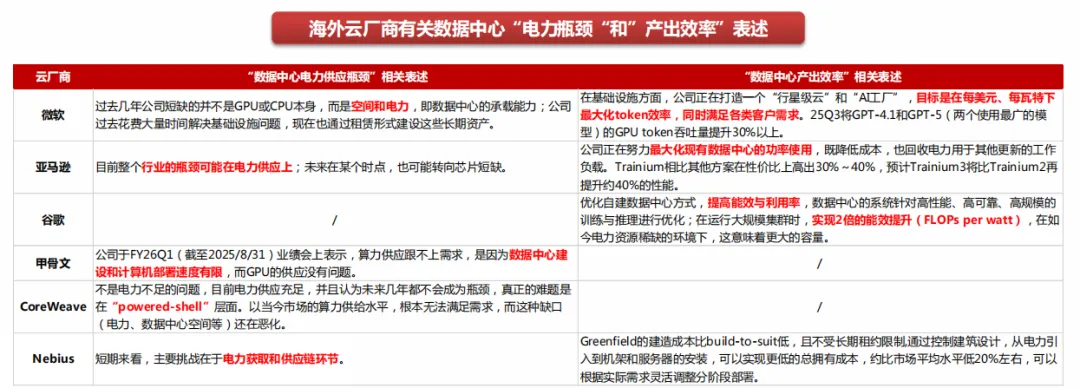 电力供应成为核心瓶颈,追求最大化每瓦特产出效率。当前,海外云厂商普遍表态当前数据中心的建设瓶颈主要在于空间和电力供应,从具体环节上看,电力瓶颈主要在于供电外壳(Powered-shell)层面。通常,云厂商在规划建设某一数据中心时,需要率先确定支持该数据中心的电力容量,然后再对数据中心内部的各类IT设备进行配置。因此,在电力容量限制下,海外云厂商均开始强调最大化现有数据中心的功率使用、最大化每瓦特下的tokens产出效率,数据中心建设将针对芯片、存储、网络等硬件环节,以及软件栈和系统架构进行全面优化,以提高数据中心能效和算力利用率。