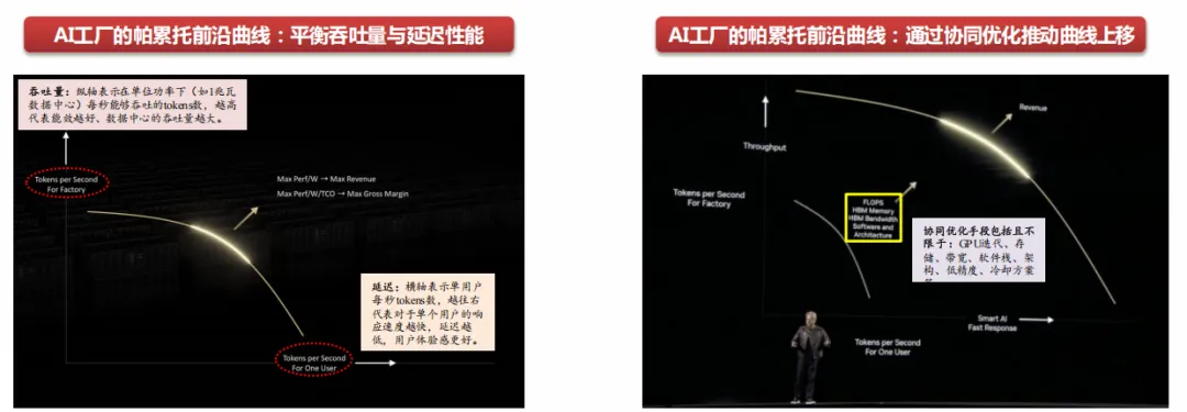 数据中心软硬件协同优化,帕累托前沿曲线加速上移。2025年,英伟达多次强调AI工厂的帕累托前沿曲线(Pareto Frontier)以及数据中心的极致协同设计(Extrem Co-Design)。AI工厂的帕累托前沿曲线揭示出数据中心在特定功率下的吞吐量与延迟之间的平衡,在该曲线上,改善一个目标意味着牺牲另一个目标,即”低延迟时吞吐量下降、高吞吐量时延迟上升”。数据中心的极致协同设计方面,包括芯片、计算系统、软件、模型架构、应用程序等各个环节,从而使得AI工厂在晶体管数量仅扩张2倍的情况下,仍然能够获得tokens产出效率10倍性能的提升。根据英伟达GTC大会,算力、存储、带宽、软件和架构等多维度的升级与优化,将推动帕累托前沿曲线向右上方推进,帮助AI工厂或数据中心实现收入的更大化。