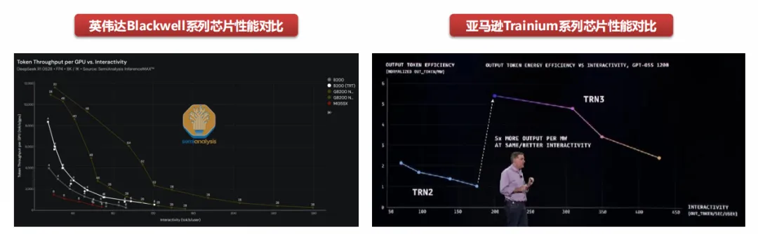 亚马逊Trainium 2 VS Trainium 3:2025年12月2日,亚马逊正式推出新一代AI训练芯片Trainium 3,并预告下一代Trainium 4的开发计划。Trainium 3是AWS首款采用3nm制程的AI芯片,专为下一代智能体、推理和视频生成应用App提供最佳Tokens经济效益而设 计。根据AWS官方 数据,搭载Trainium 3芯片的Trn3 UltraServer系统在性 能上实现显 著提升,Amazon EC2 Trn3在能效比上每兆瓦所处理的token数量达前代产品的5倍。
