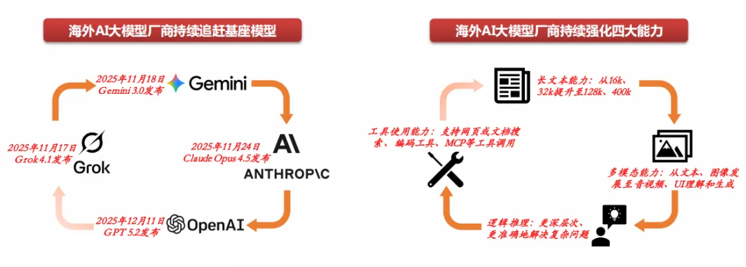 当前,AI基础大模型竞争已进入高强度、快迭代阶段,2025年11月至12月,Grok 4.1、Gemini 3.0、Claude Opus 4.5、GPT-5.2相继发布,模型竞争形成追赶态势,反映头部大模型厂商在算力投入、模型训练与工程化能力上持续加码;未来,基座大模型与特定领域的持续优化仍是主要竞争方向。从模型能力上看,大模型迭代主要围绕