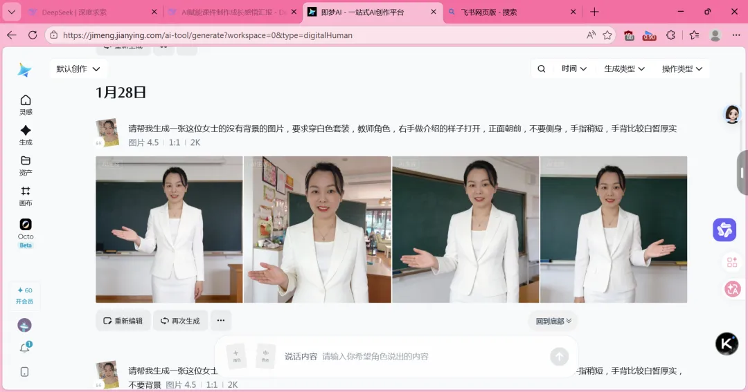 我想起了刘赣洪教授分享过的“即梦AI换装”功能。说实话,当时心里直打鼓:这玩意儿真能行?我硬着头皮上传了一张生活照,哆哆嗦嗦地敲下第一行指令:请帮我生成一张这位女士的没有背景的图片,要求穿白色套装,教师角色,右手做介绍的样子打开,正面朝前,不要侧身,手指稍短,手背比较白皙厚实。几秒钟后——我愣住了。