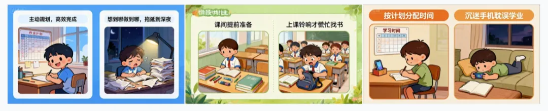 趁热打铁,我又生成了三张情景对比卡片:帮我生成三张情景对比卡片,每张包含两幅对比图片,内容是——1.“主动规划作业顺序高效完成 vs 想到哪做到哪拖延到深夜”;2.“课间提前准备好下节课用品 vs 上课铃响才慌忙找课本”;3.“按计划分配娱乐与学习时间 vs沉迷手机耽误学业”;要求每张图片风格统一,有图有文字。