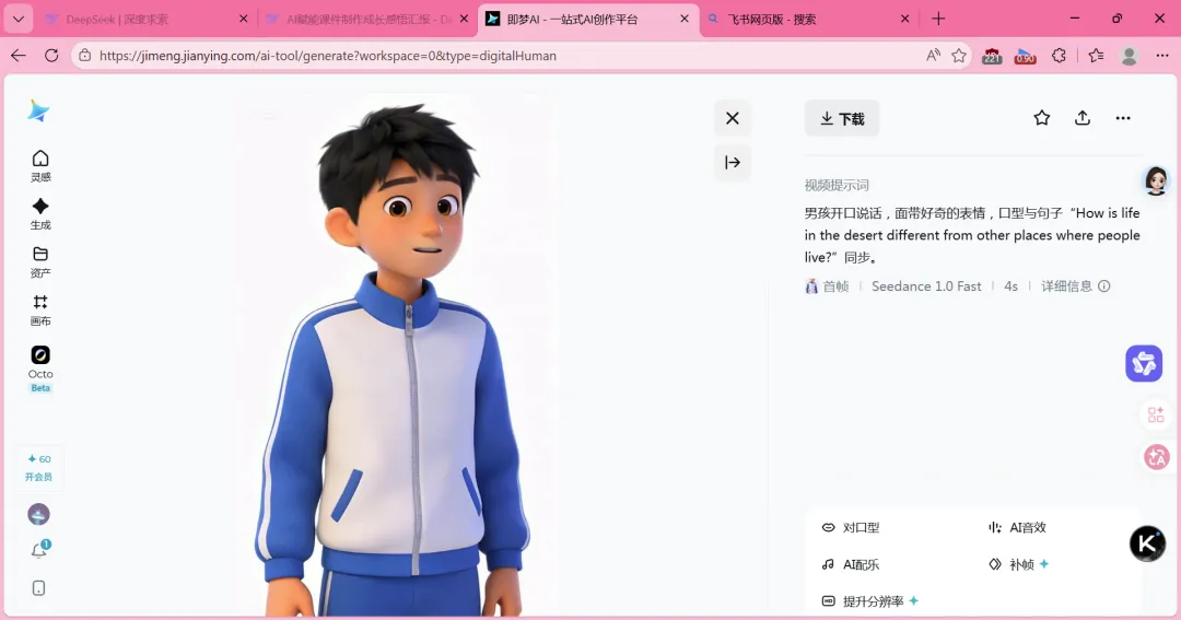 我用即梦数字人,上传了一个学生形象,输入一句英文台词:“How is life in the deert different from other places where people live?” 要求对口型输出并脸部表情:好奇,点击生成。不到一分钟,数字人真的开口了——口型几乎完美,表情带着探索的光芒。我再把视频导入剪映,导入配音和字幕。当这个“数字学生”出现在课堂上时,孩子们的眼睛一下子亮了。