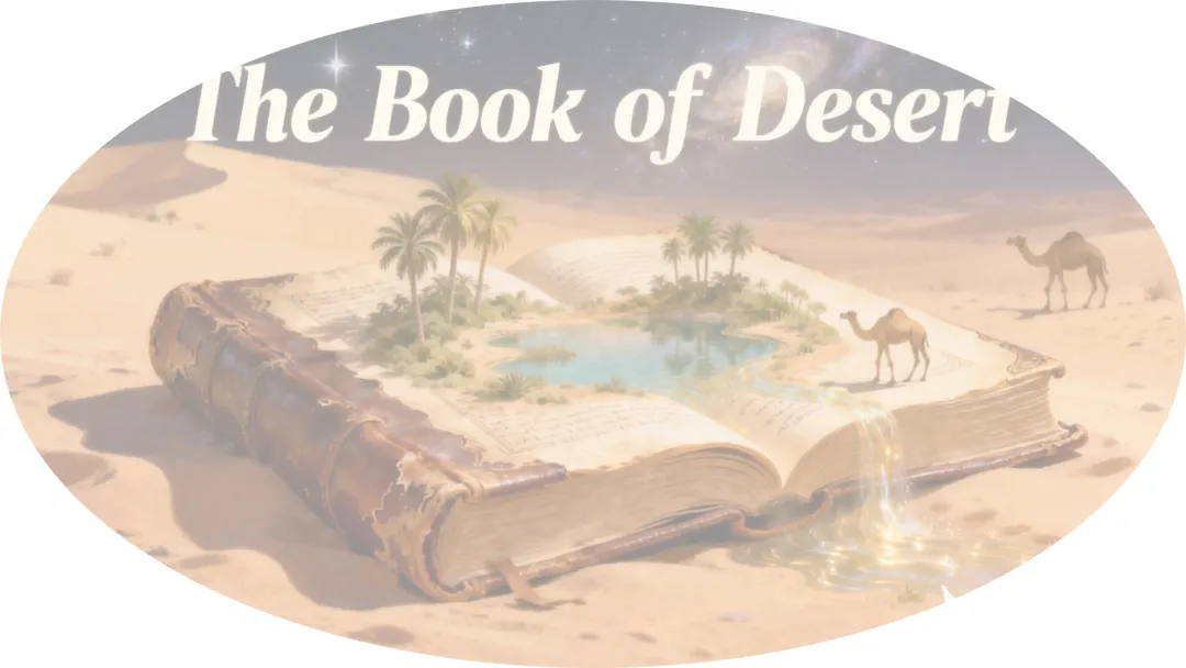 2.封面情境熏陶:沙漠里一部打开的古籍,有绿洲和水源零星分布,配文:The Book of Desert.