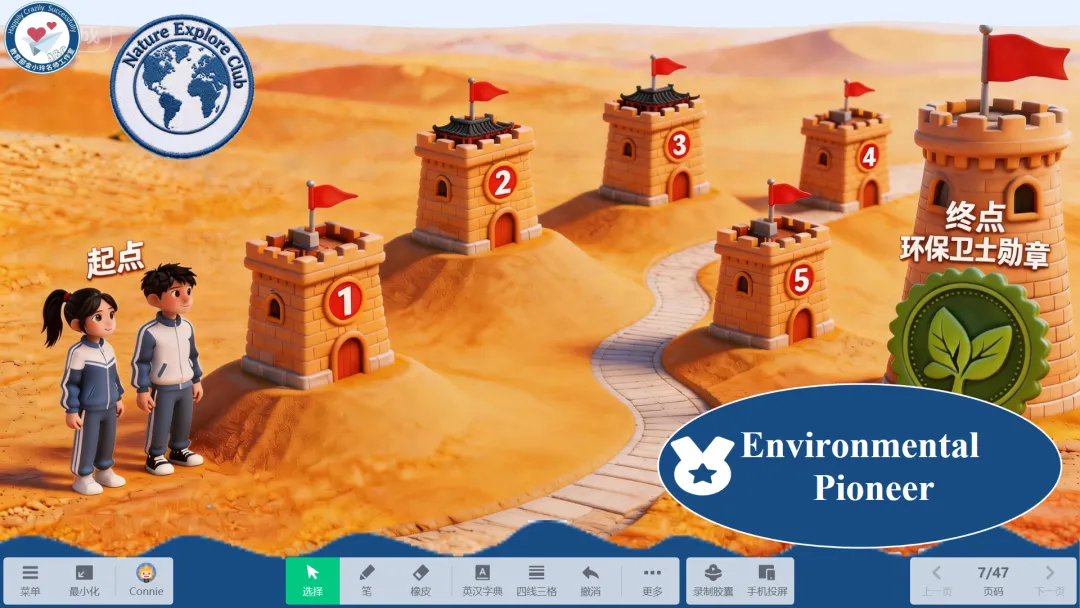 4.快乐英语任务驱动式情境,需要设计沙漠闯关,总共五个关卡,起点处有数字人A和B ,终点处有环保卫士勋章,每个关卡零星分布,不要一字排开。课堂上,学生从起点出发,每完成一个任务,就“前进”一关。整个教室变成了沙漠探险营,没有人走神,没有人偷懒。